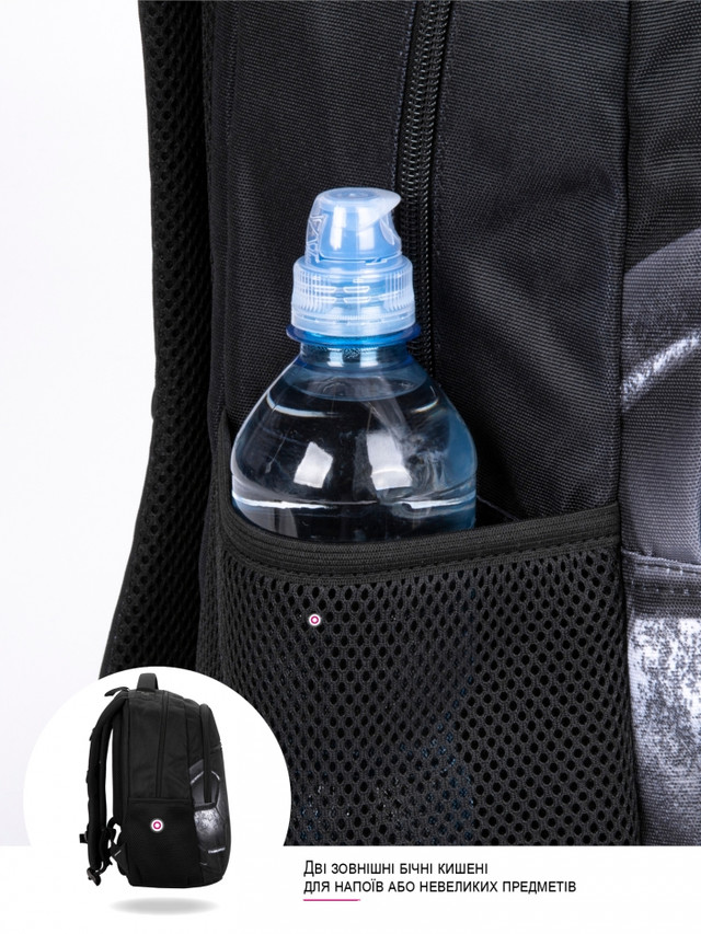- Дві бокові сітчасті кишені на гумці – для пляшечки з водою чи аксесуарів