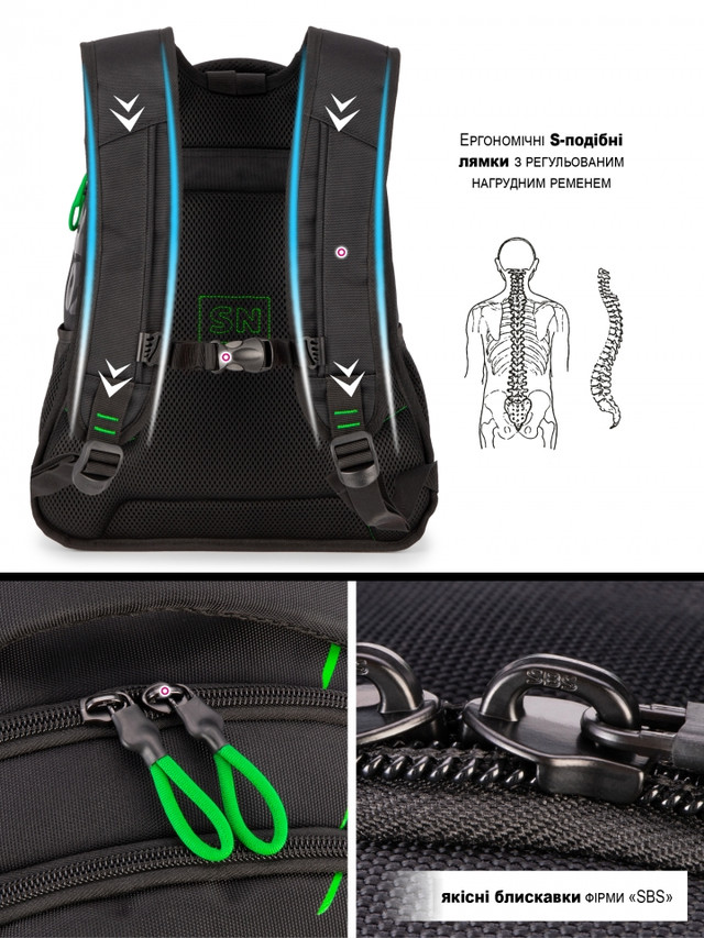 Рюкзак шкільний ортопедичний для хлопчика підлітковий 5-11 клас три змійки чорний з зеленим SkyName 90-148-11