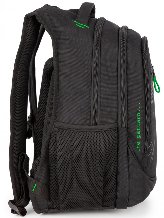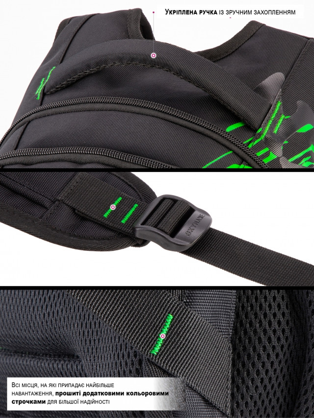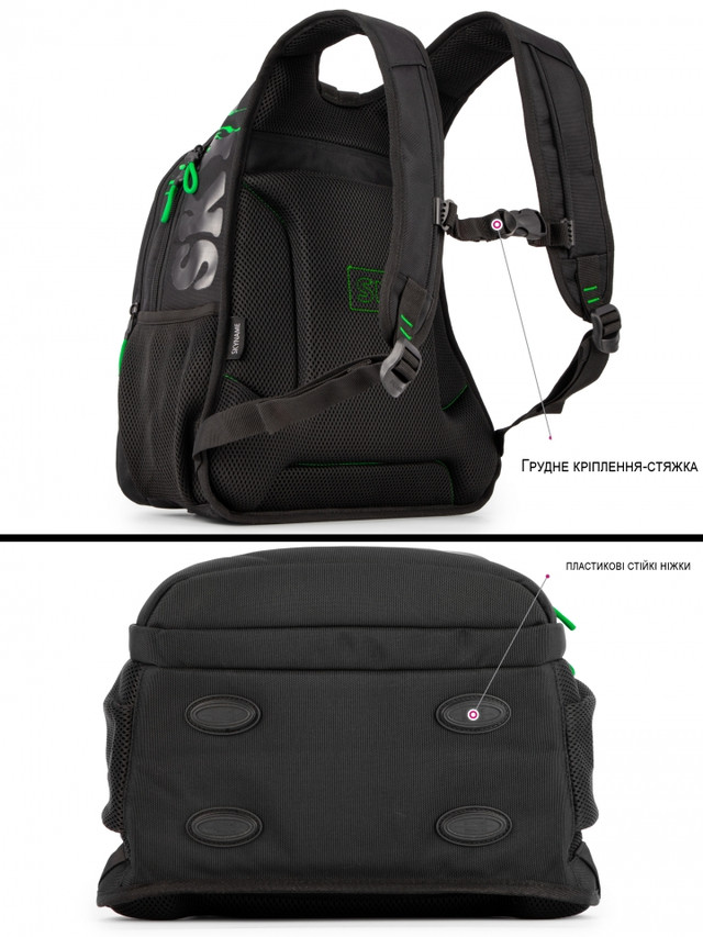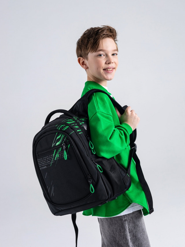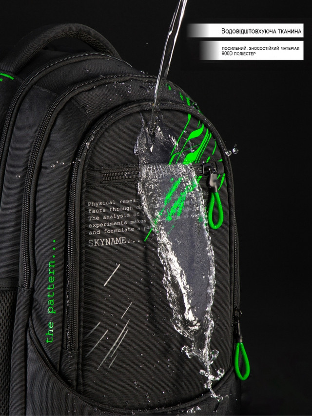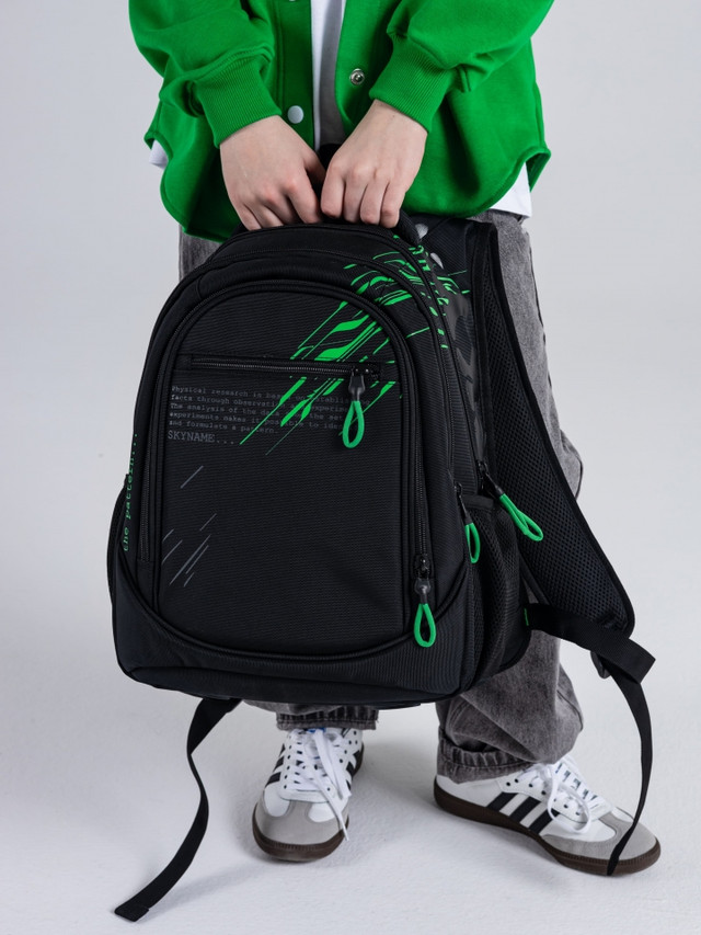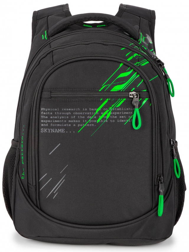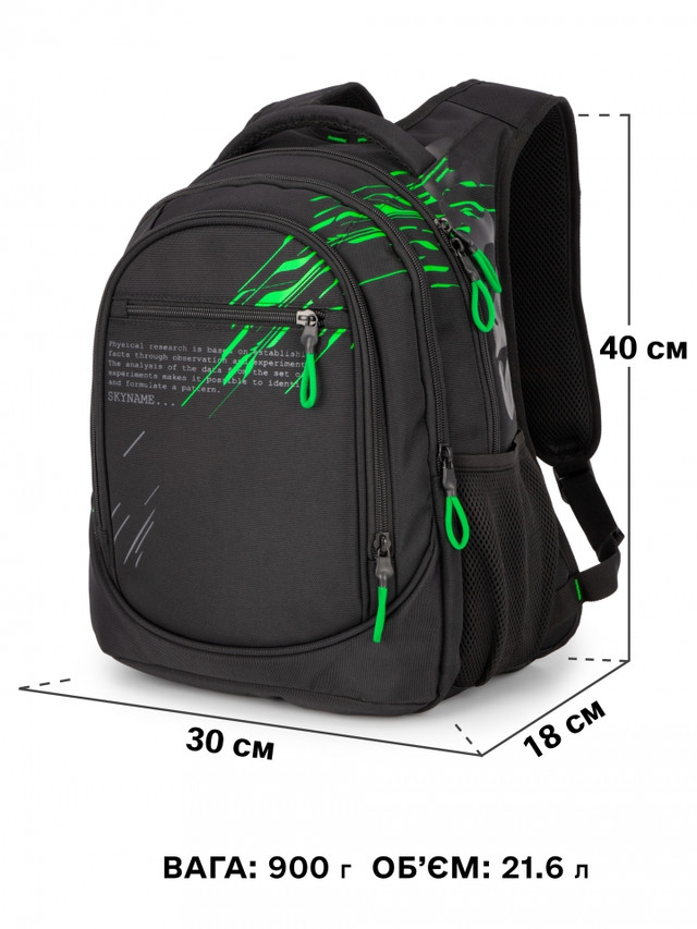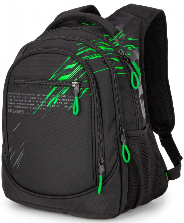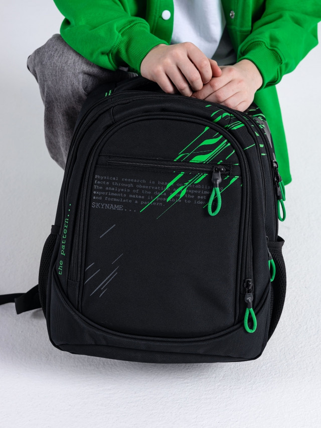 Модний підлітковий ортопедичний рюкзак портфель ранець SkyName 90-148-11 чорний з зеленим на три відділи на змійках із модним абстрактним принтом.
