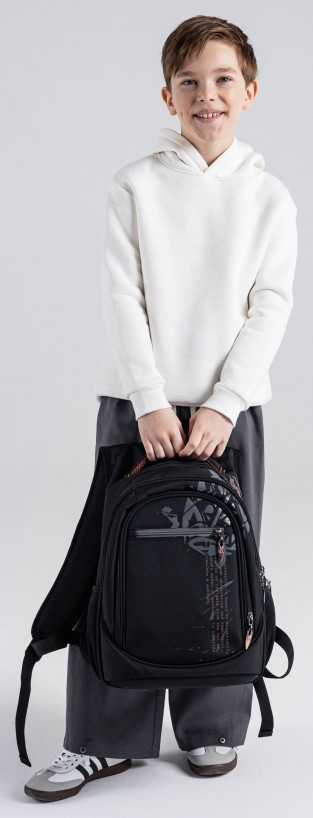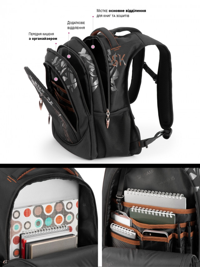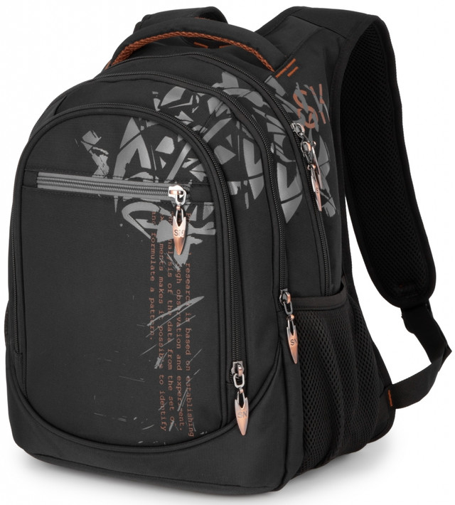 Модний підлітковий ортопедичний рюкзак портфель ранець SkyName 90-146-3 чорний з коричневим на три відділи блискавки на змійках із модним абстрактним принтом.