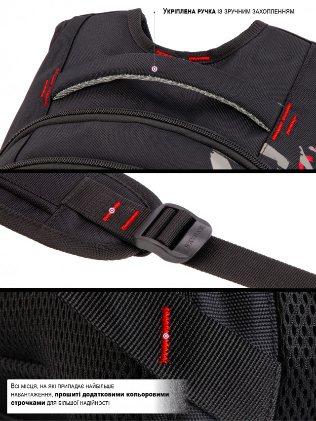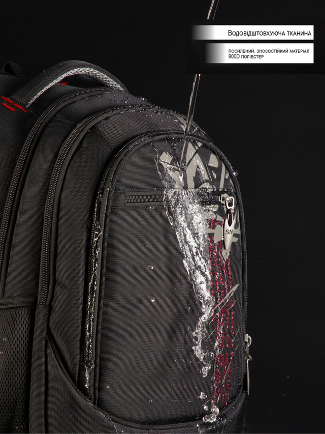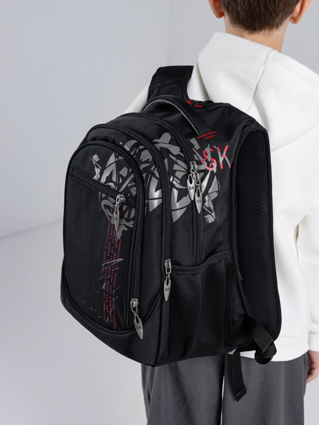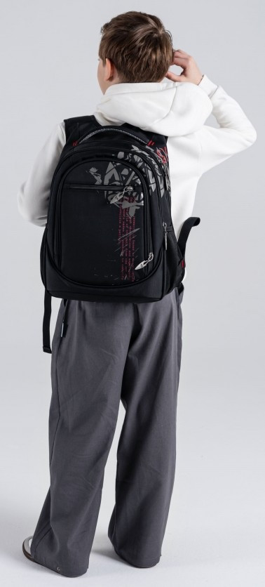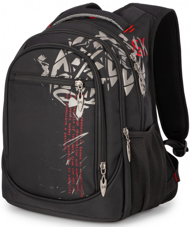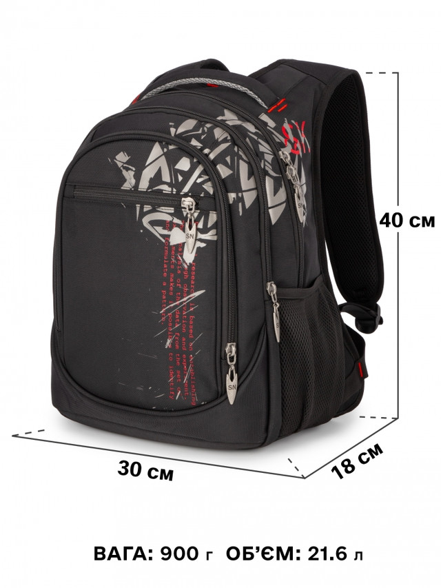 Модний підлітковий ортопедичний рюкзак портфель ранець SkyName 90-146-2 чорний з червоним на три відділи блискавки на змійках із модним абстрактним принтом.